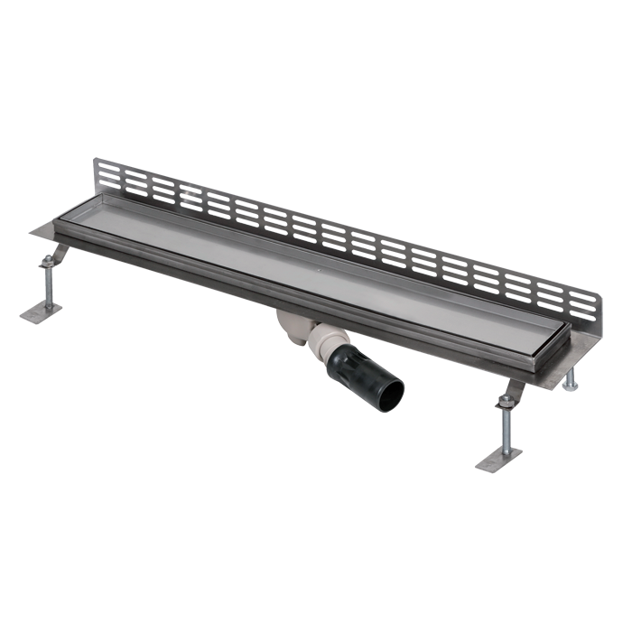 SLKN 15 - Supply No. 69150 - drain, stainless steel tub (for tiles insert, max. height of tiles 12 mm - drain for higher tiles could be made to order), siphon, mounting legs with M10 screw (4 pcs.), tool for grid remove, waterproofing tape, mounting set