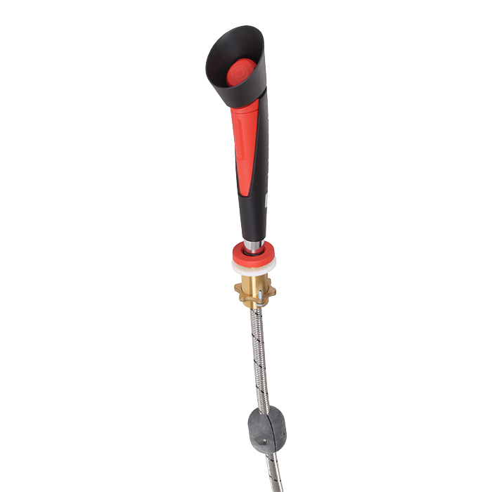 - hand-held eyewash shower with one spray head, head at an angle of 45 degrees with desk holder