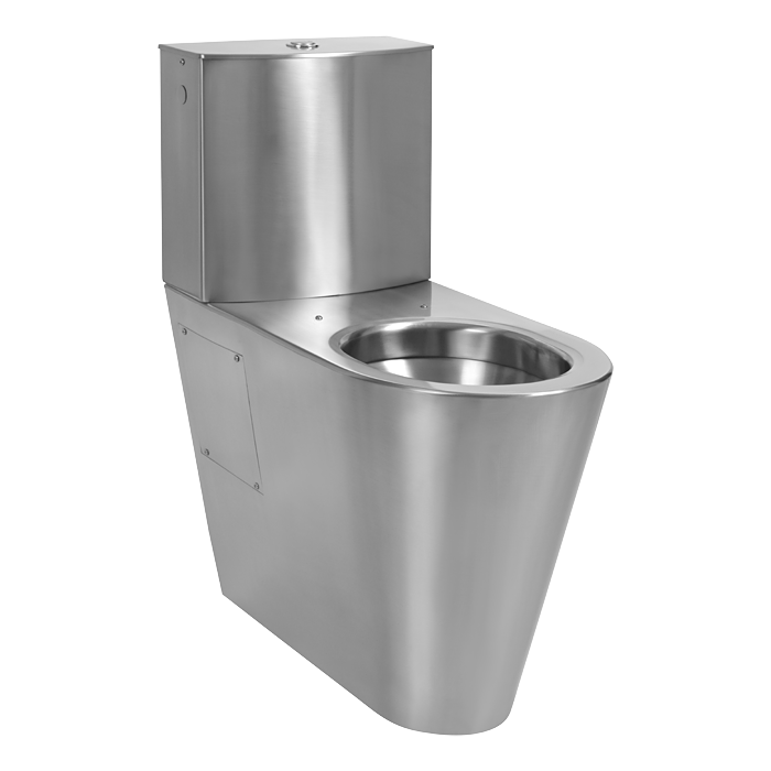 - stainless steel floor standing toilet with a tank, fixed to the wall and floor